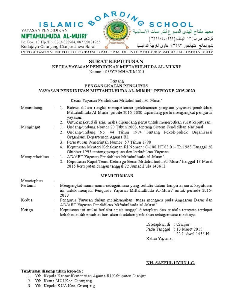 Pembina yayasan bani hasan karawang. Kami mengulas tentang contoh surat keputusan pengangkatan pengurus yayasan. Hasil musyawarah pengurus yayasan dalam rangka pemberian tugas poko dan fungsi kepengurusan di pondok pesantren tanggal 25 juni . Tentang pengangkatan pengawas dan pengurus . 01 dp yfh iv 2015 pengangkatan pengurus yayasan.